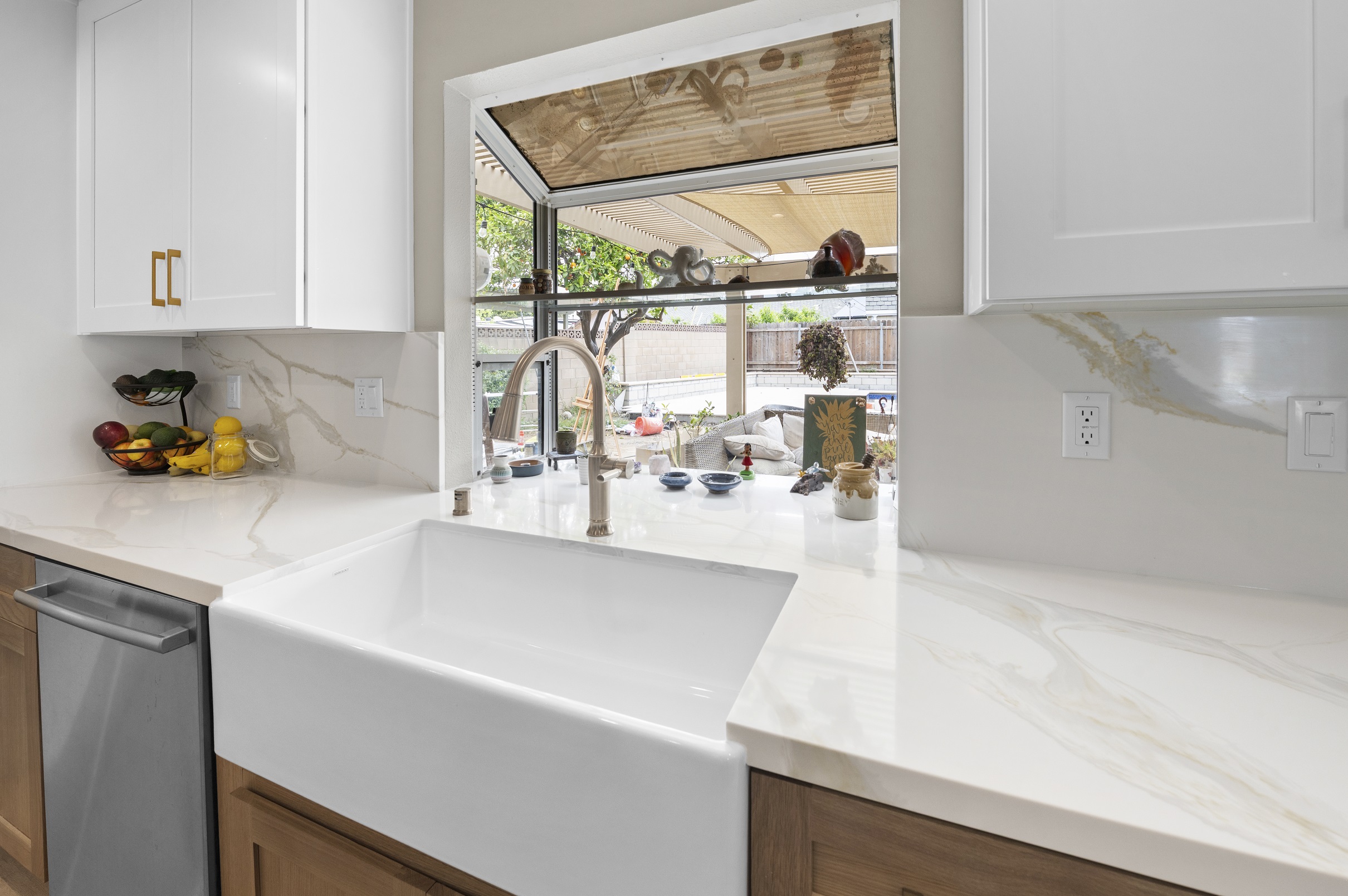 A full quartz backsplash adds a touch of elegance and visual continuity behind the countertops, while the large apron-front farmhouse sink offers both charm and function.