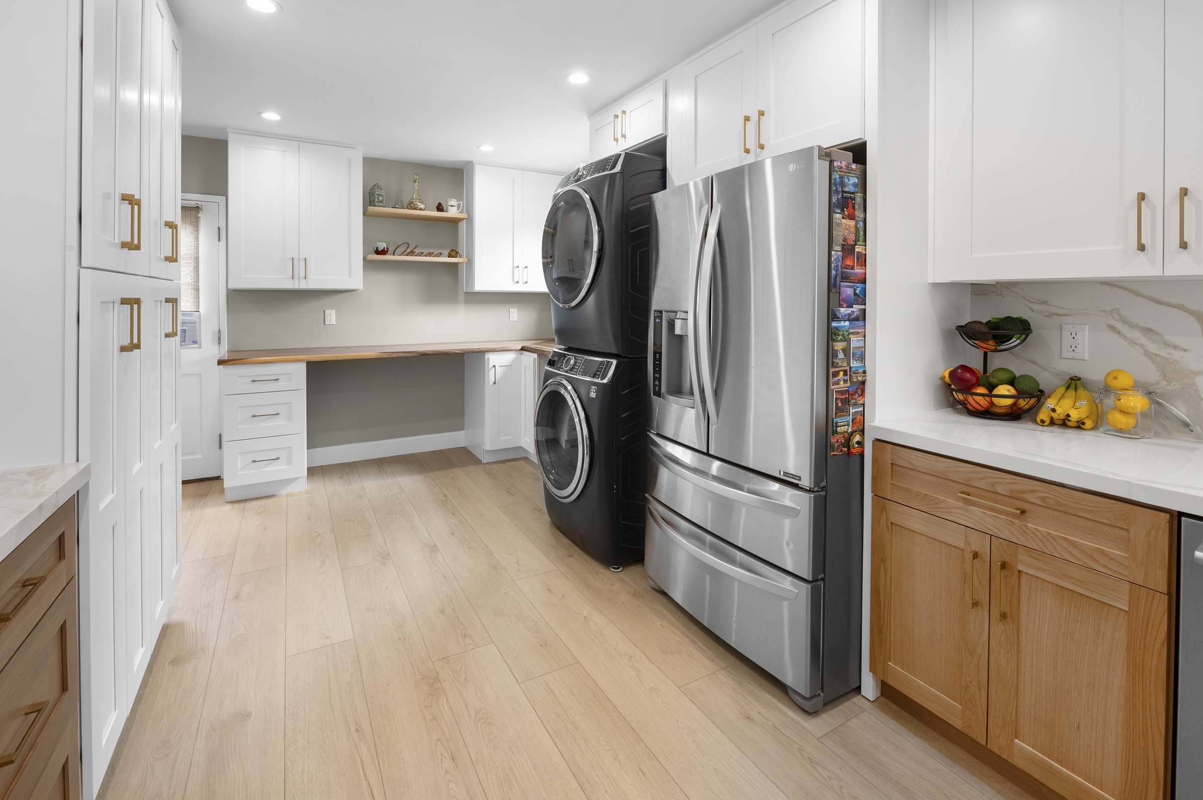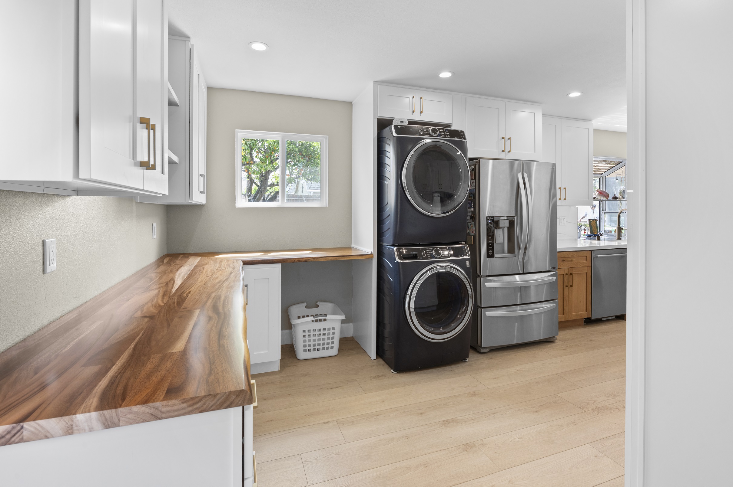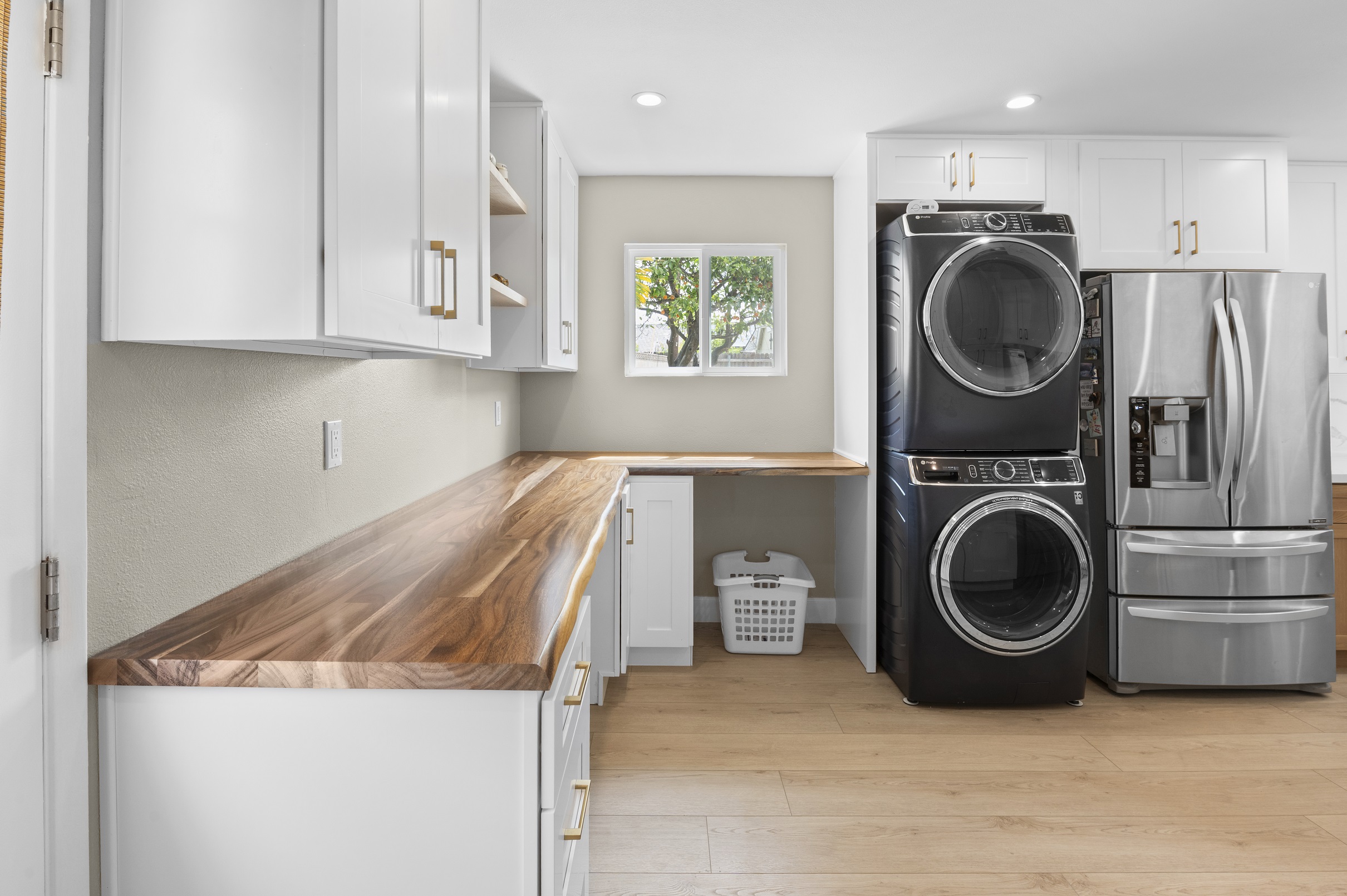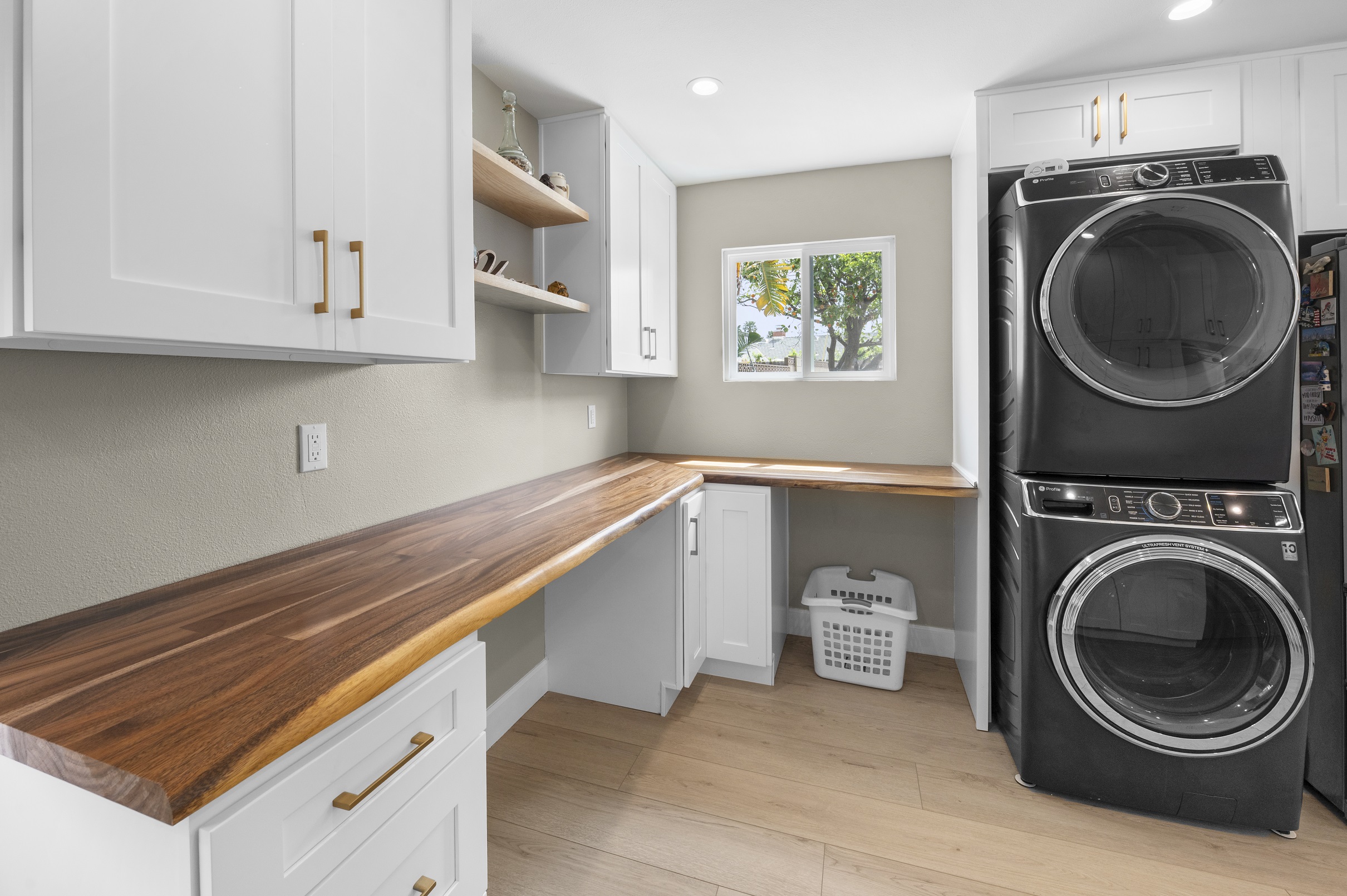 In the adjacent laundry room, we installed custom cabinetry and butcher block countertops, offering both warmth and practical workspace.