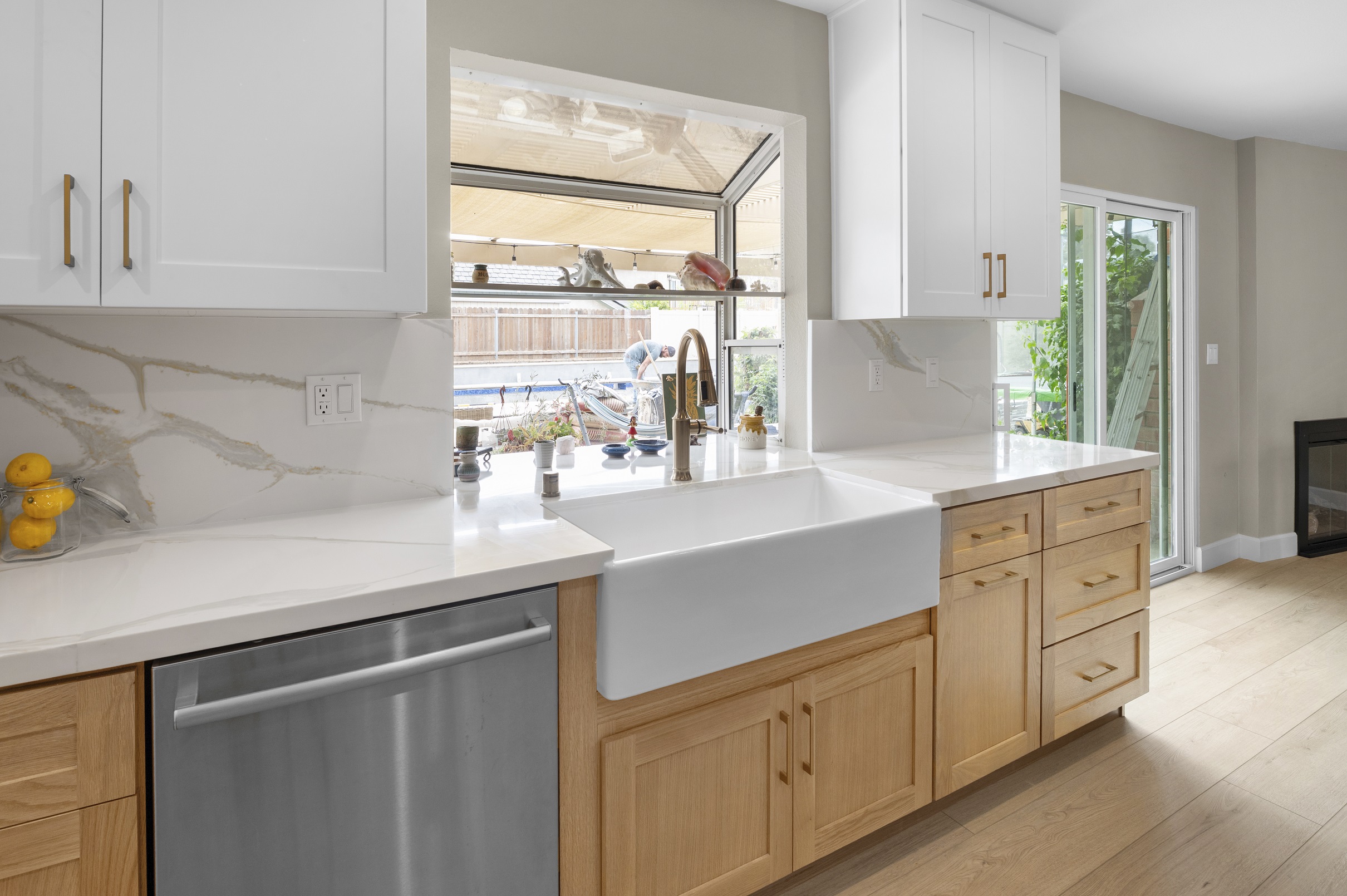 The new cabinetry features a soft two-tone finish with warm wood lowers and crisp white uppers, paired perfectly with sleek brass hardware.