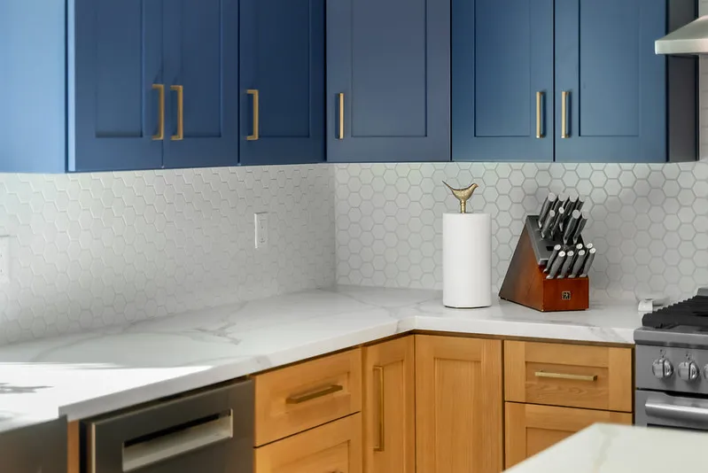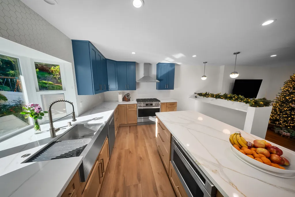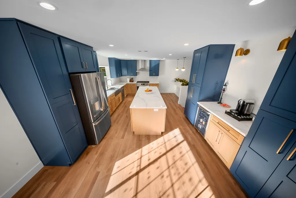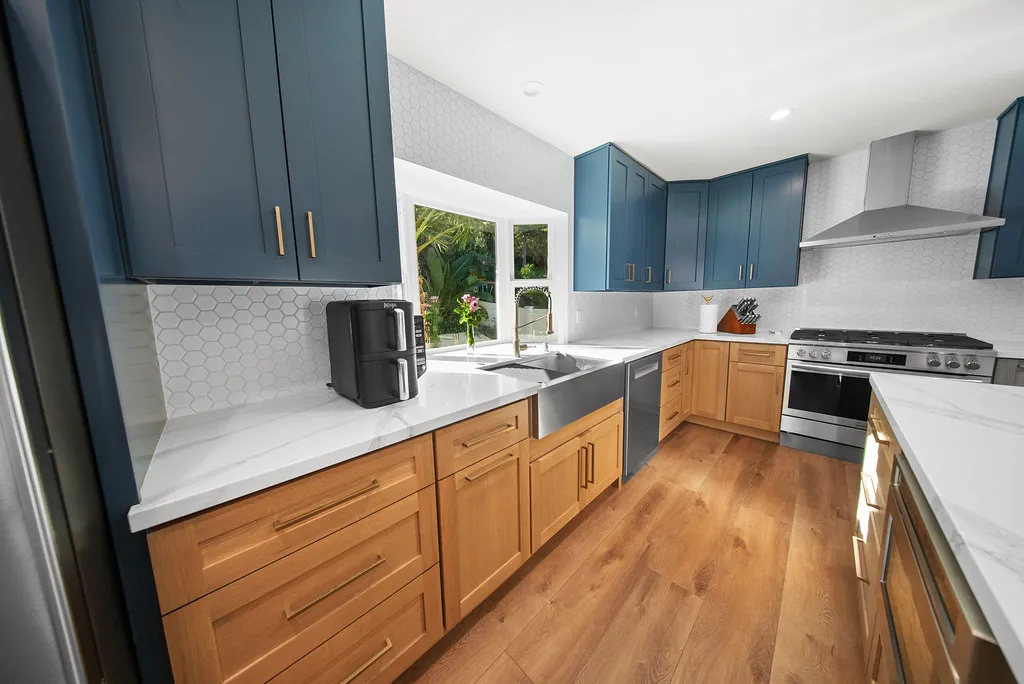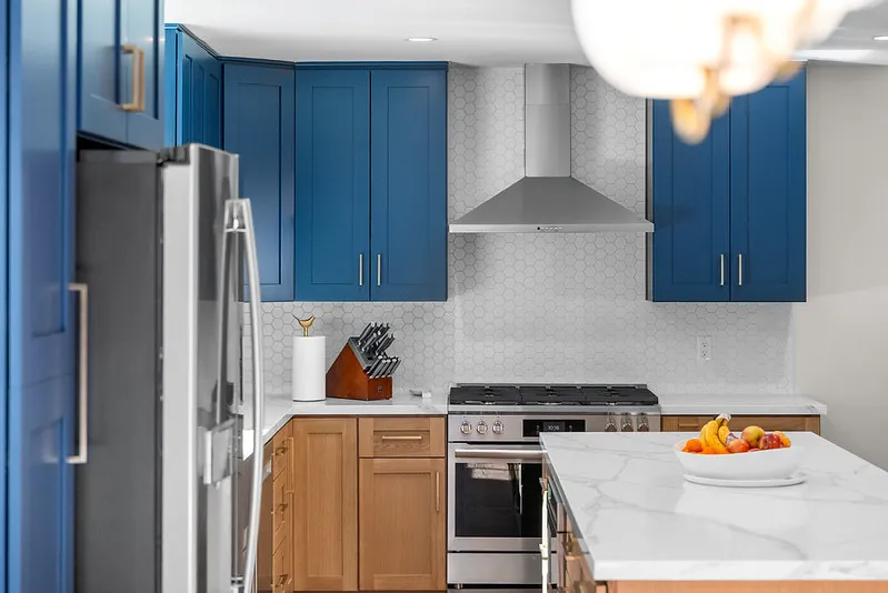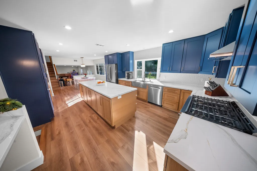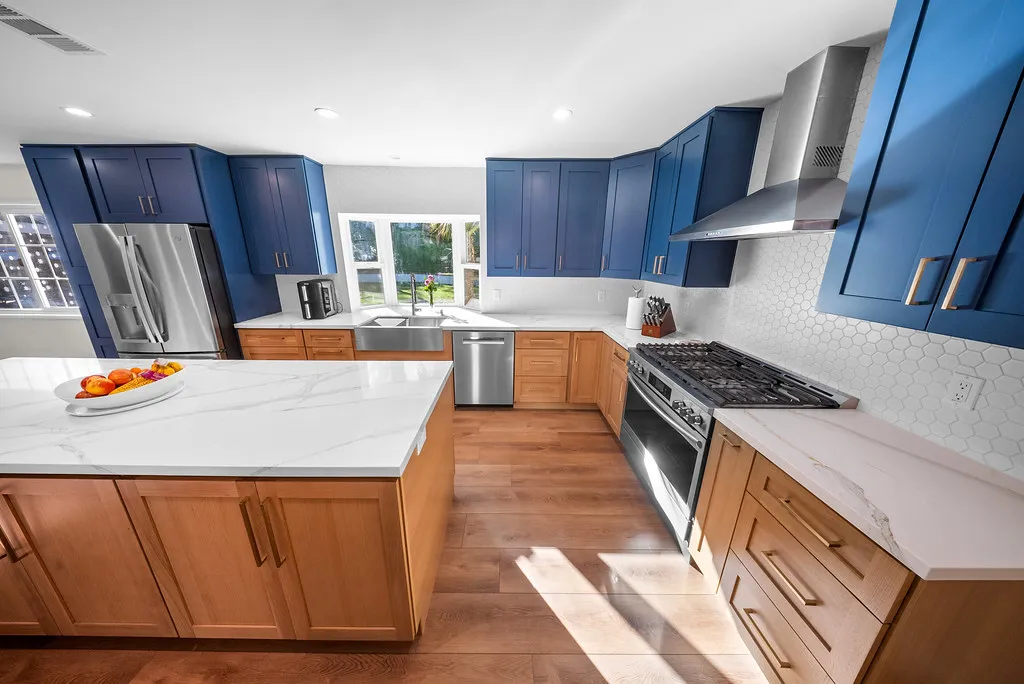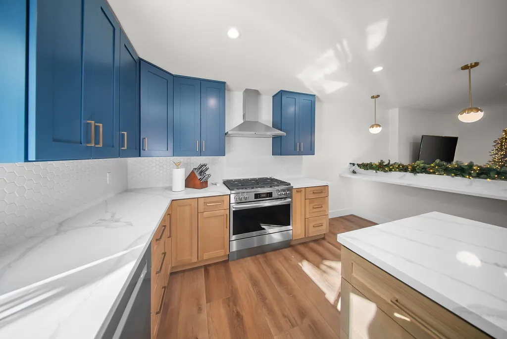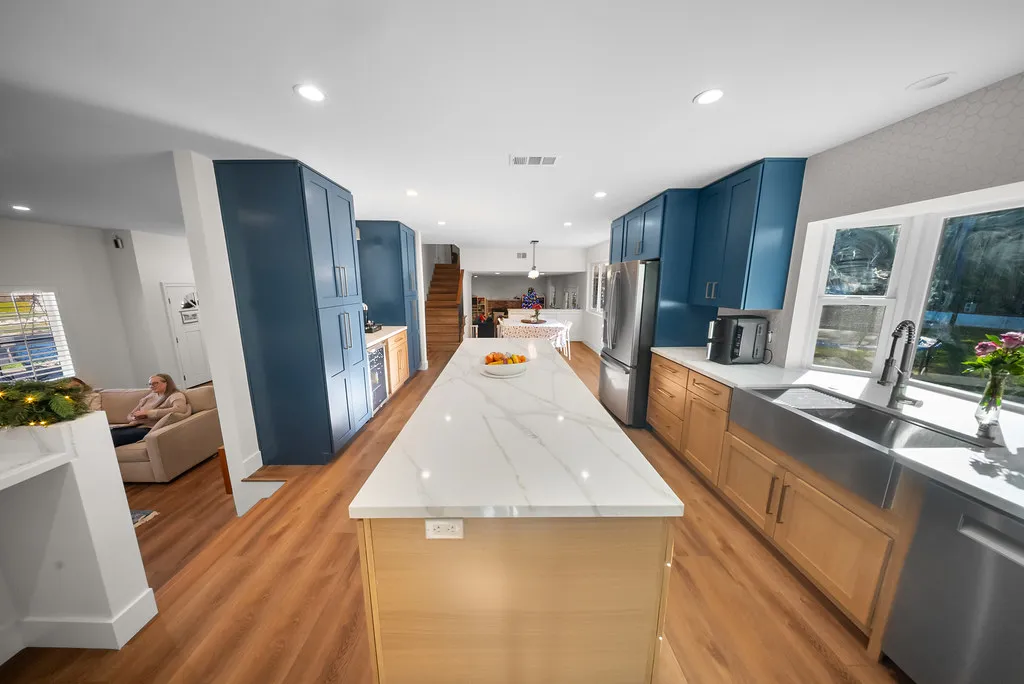 The kitchen now showcases a striking two-tone cabinet palette, featuring matte navy upper cabinets paired with natural wood base cabinetry. Quartz countertops with bold veining wrap the space, while a spacious center island provides ample prep area and integrated appliances. A custom backsplash introduces texture and visual depth without overpowering the design.