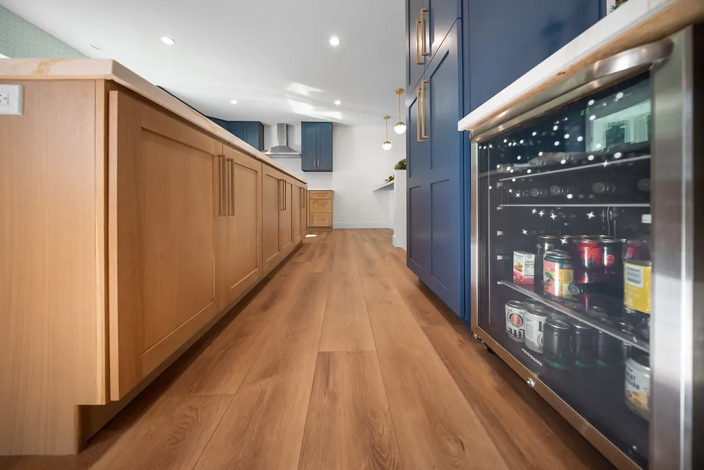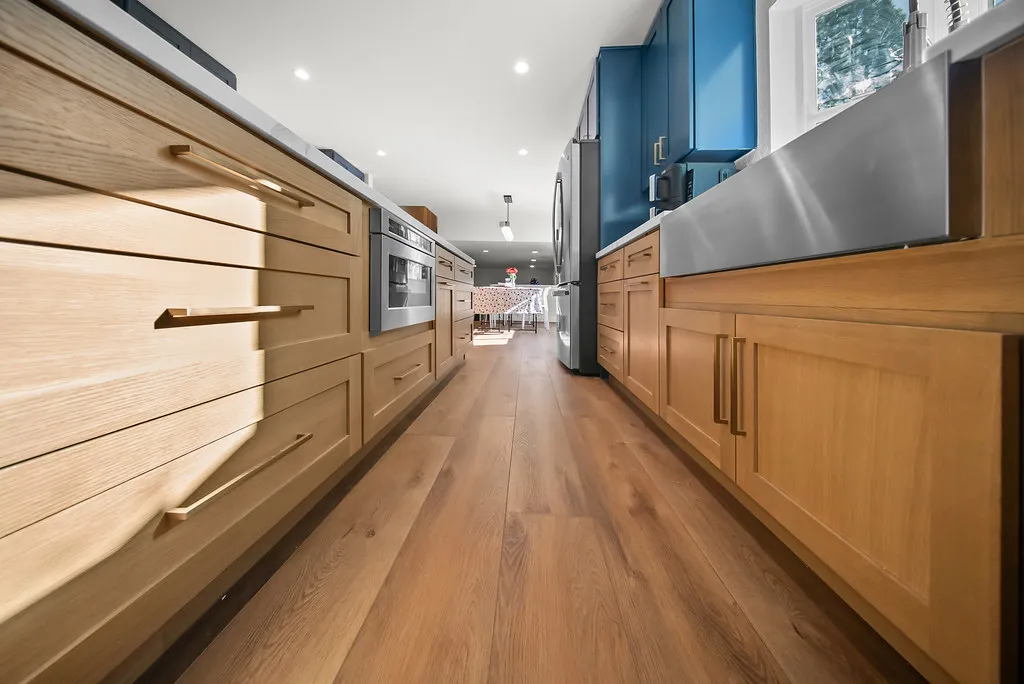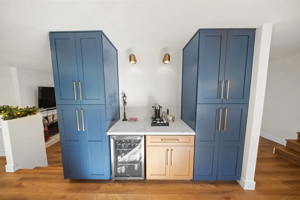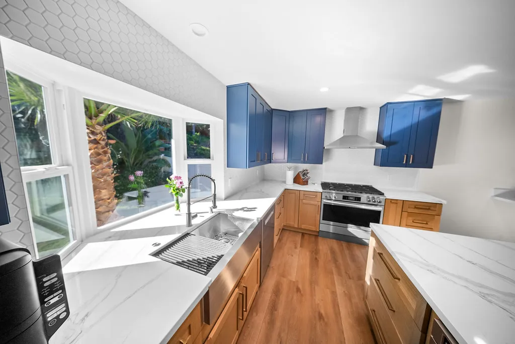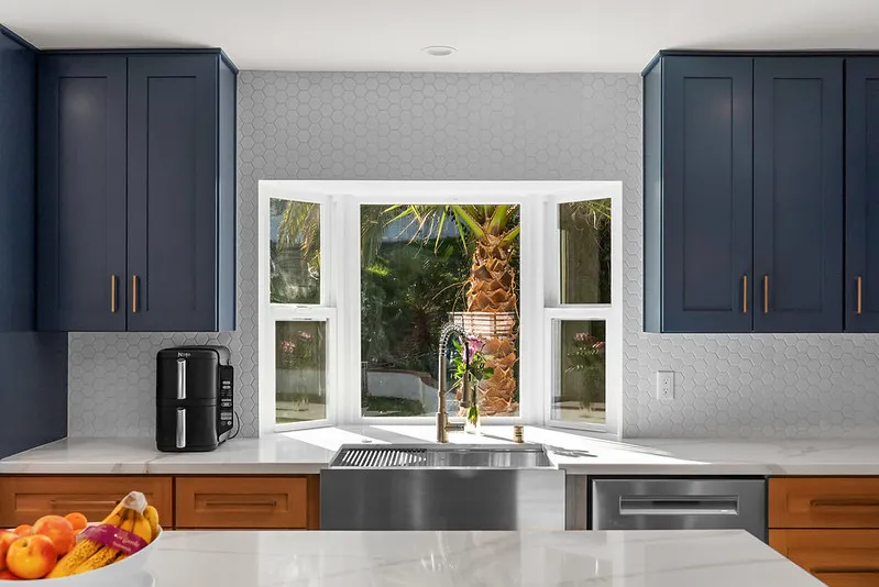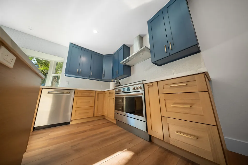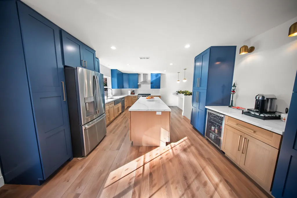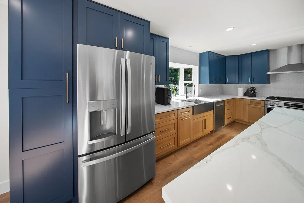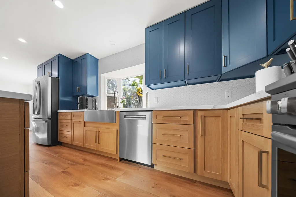 The kitchen now showcases a striking two-tone cabinet palette, featuring matte navy upper cabinets paired with natural wood base cabinetry. Quartz countertops with bold veining wrap the space, while a spacious center island provides ample prep area and integrated appliances. A custom backsplash introduces texture and visual depth without overpowering the design.