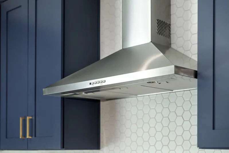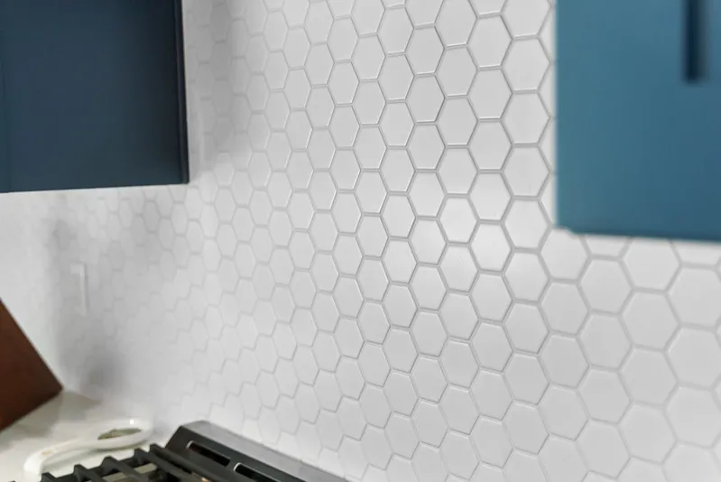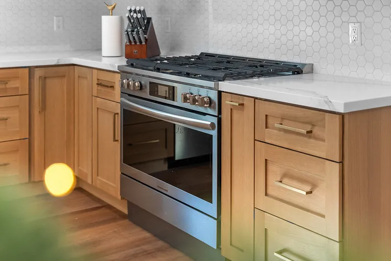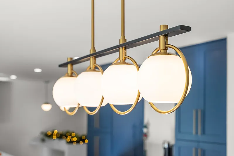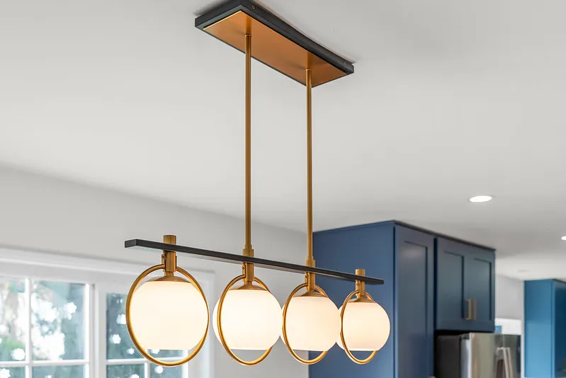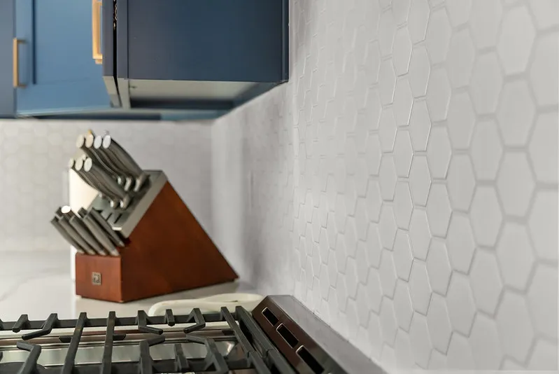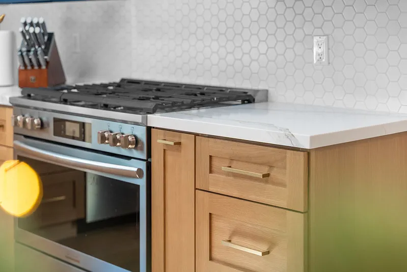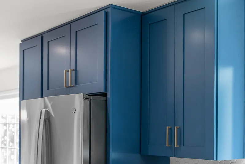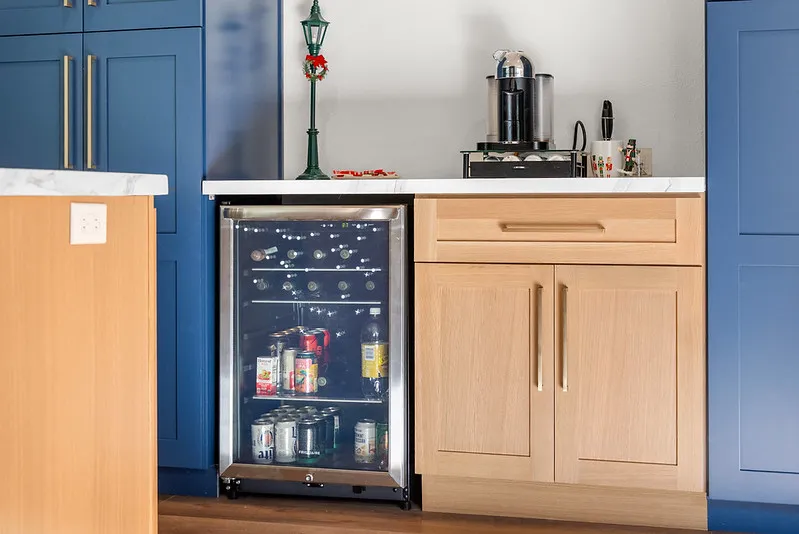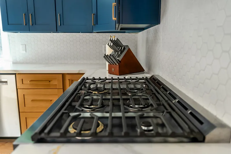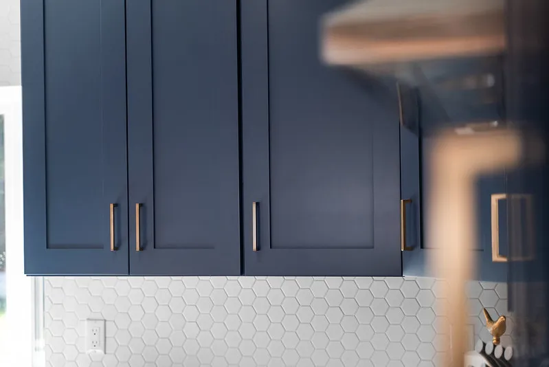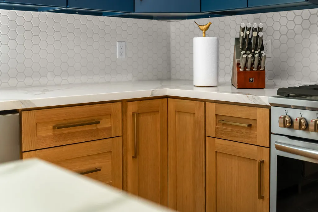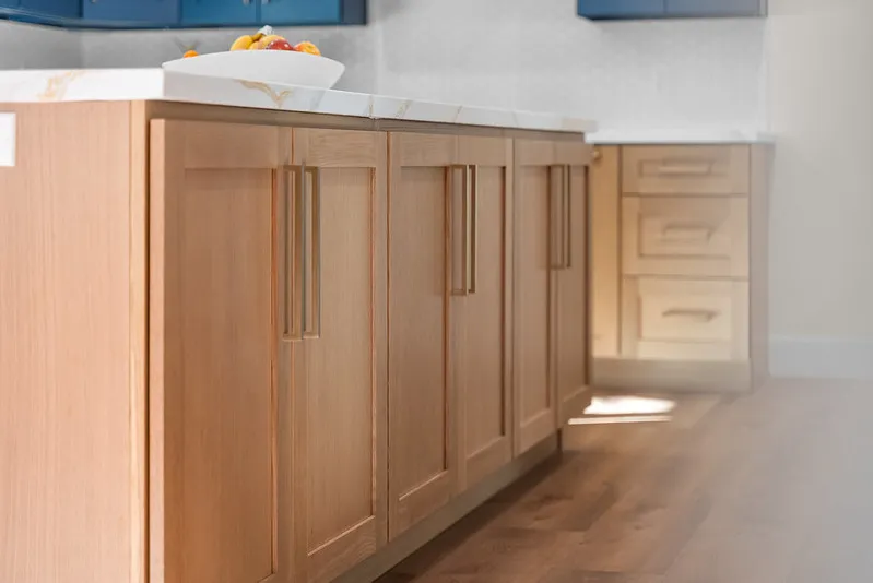 The kitchen now showcases a striking two-tone cabinet palette, featuring matte navy upper cabinets paired with natural wood base cabinetry. Quartz countertops with bold veining wrap the space, while a spacious center island provides ample prep area and integrated appliances. A custom backsplash introduces texture and visual depth without overpowering the design.