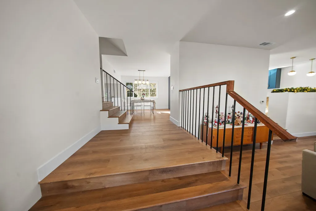 This Thousand Oaks home was fully reimagined with a modern, open first-floor design that blends warmth with refined style. The renovation included a complete kitchen remodel, removal of interior walls to enhance flow, new flooring throughout, fresh interior paint, an upgraded bay window, and a sleek new stair railing.