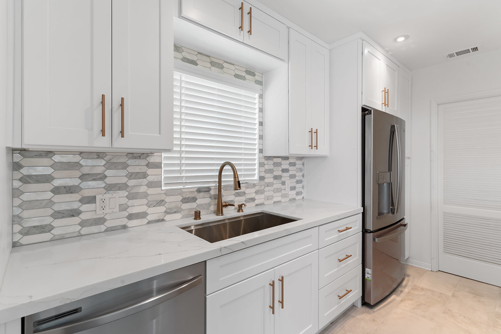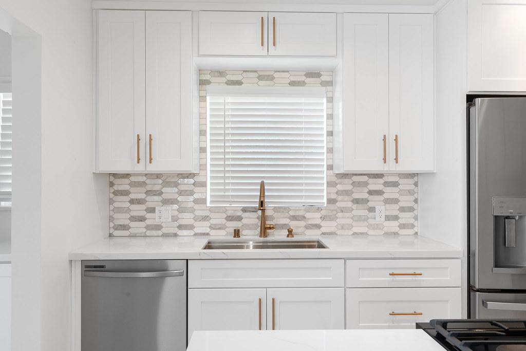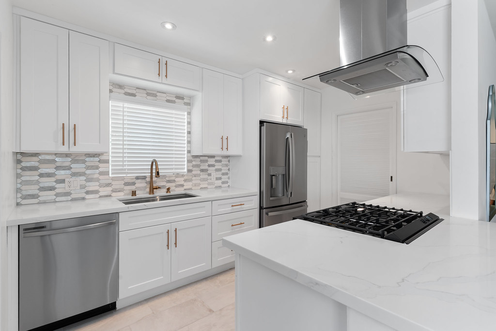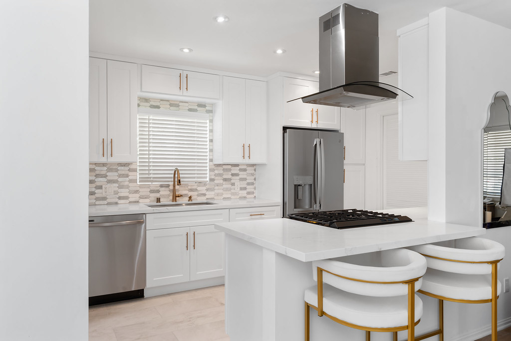 The kitchen now features white shaker cabinetry, quartz countertops, warm brass hardware and a spacious layout for easy entertaining.