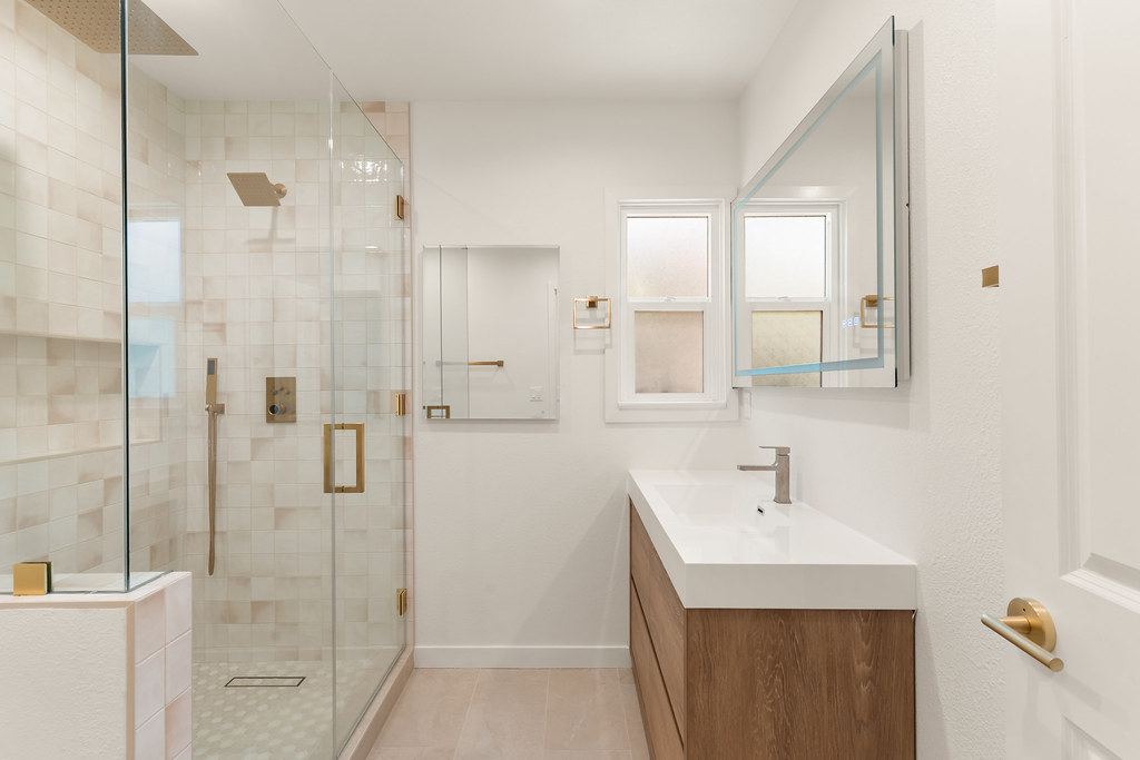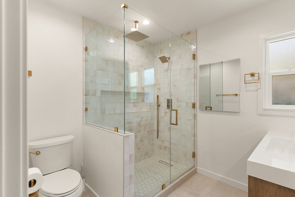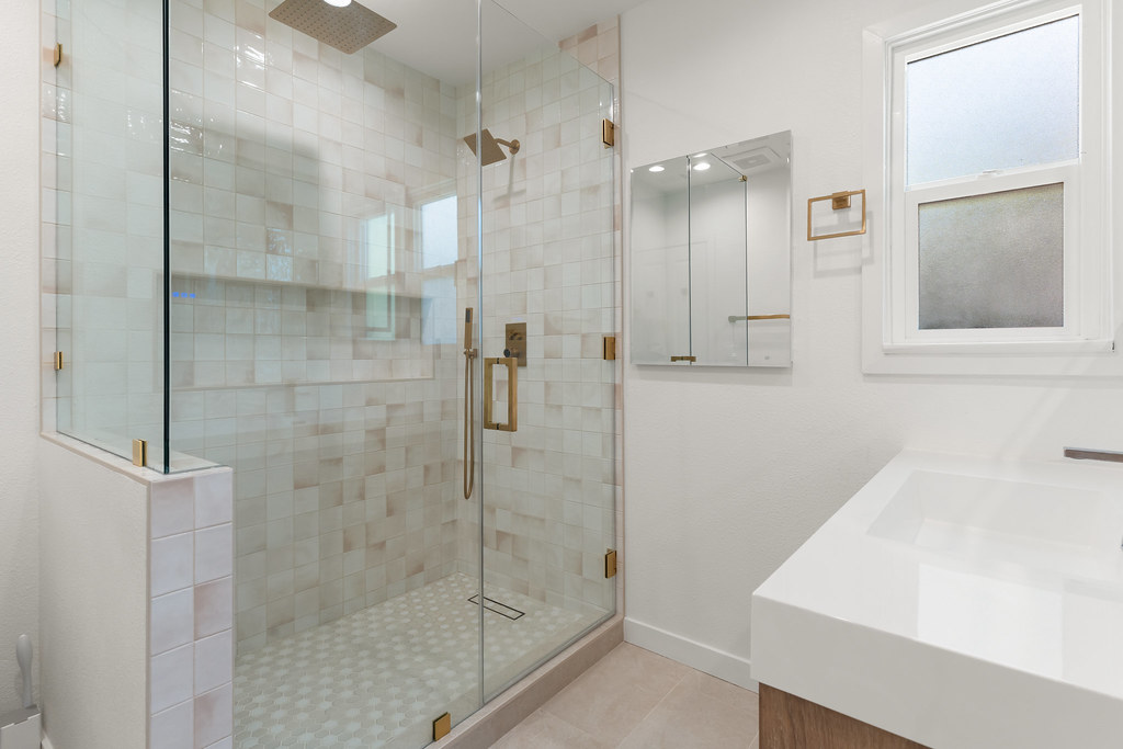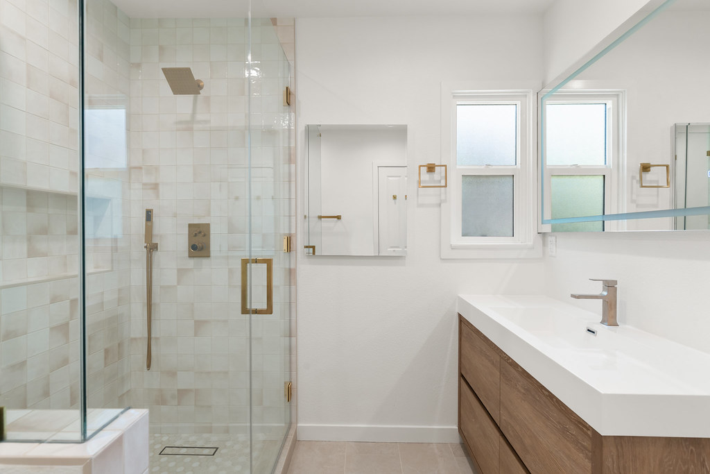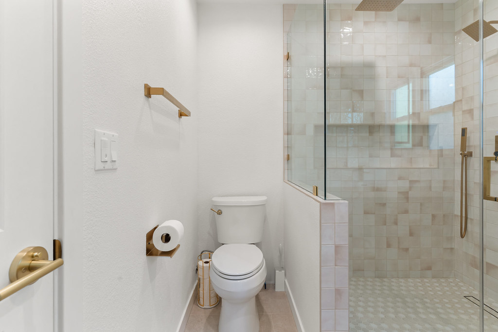 In the bathroom, we went with handcrafted tiles, modern glass enclosures, and brushed brass accents that bring both function and style.