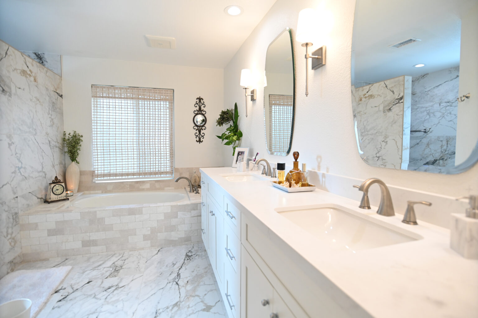 Crowned with stunning quartz countertops and mirrors, it’s a functional work of art. This master bathroom remodel is a testament to our commitment to turning dreams into reality.
