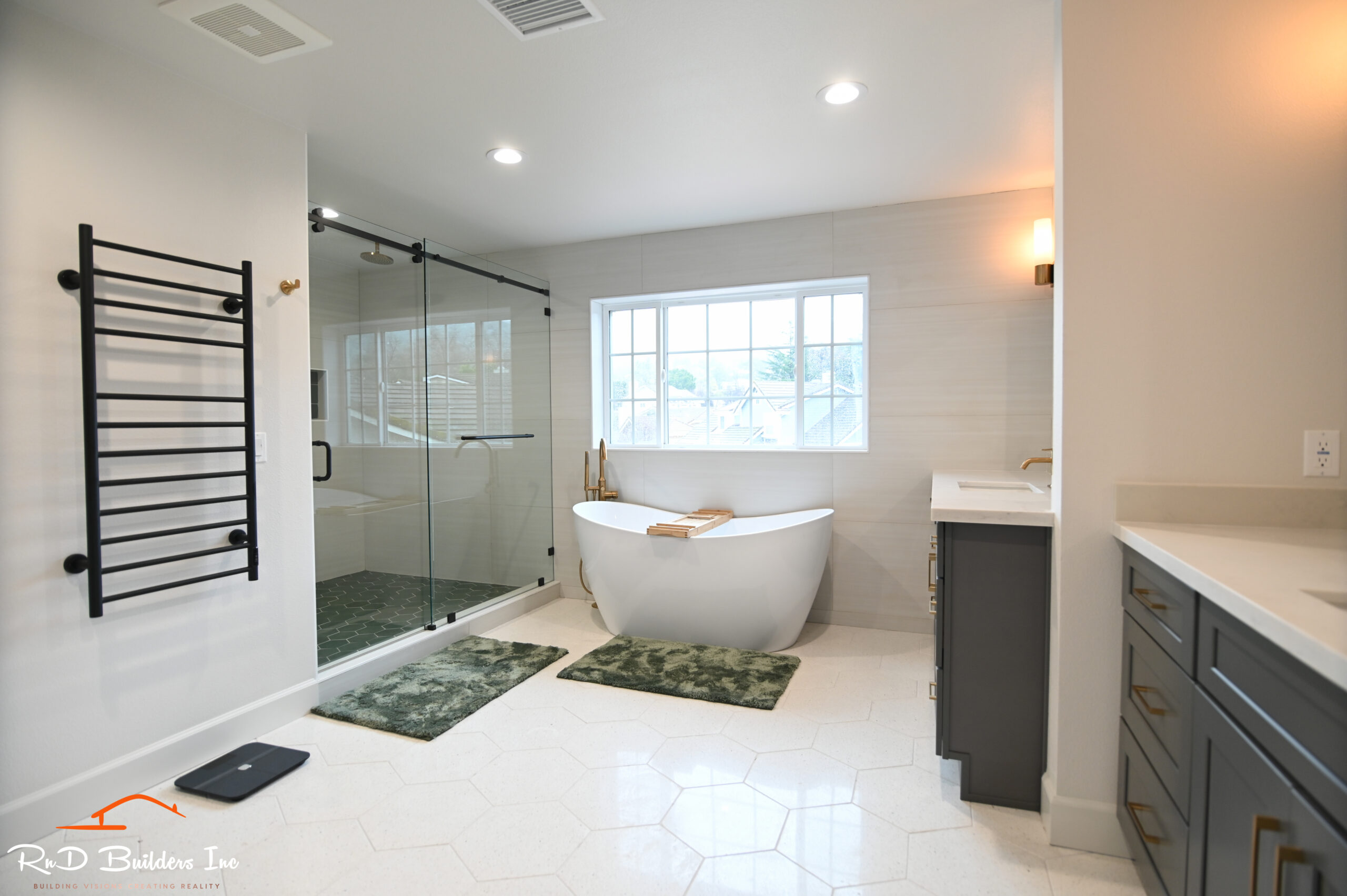 Massive 3,000 Sqf Remodel, Added about 700 Sqf to the house. We replaced the entire floors for the house, new roofing and addition of about 700 sqf. Completely new open kitchen with a big island in the middle, master bedroom and bathroom with a full tub shower combination. White Shaker for Kitchen Cabinets and Granite, Custom made Island and Hood, Commercial Appliances, 2 Backsplashes. Bathroom is green and beautifully done with 48×24 tile walls and green hexagons for the floors.